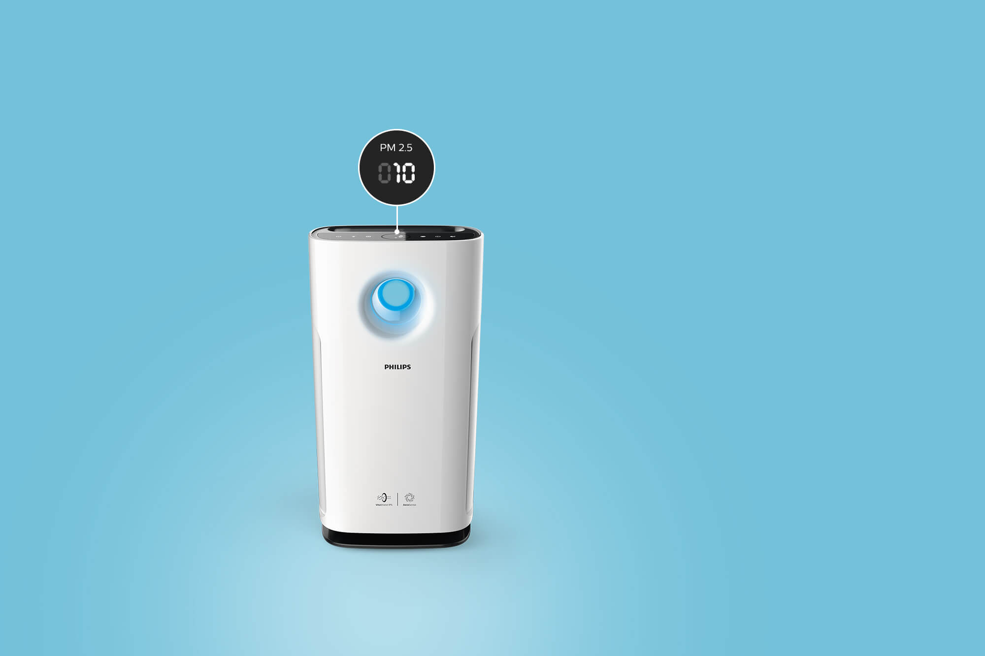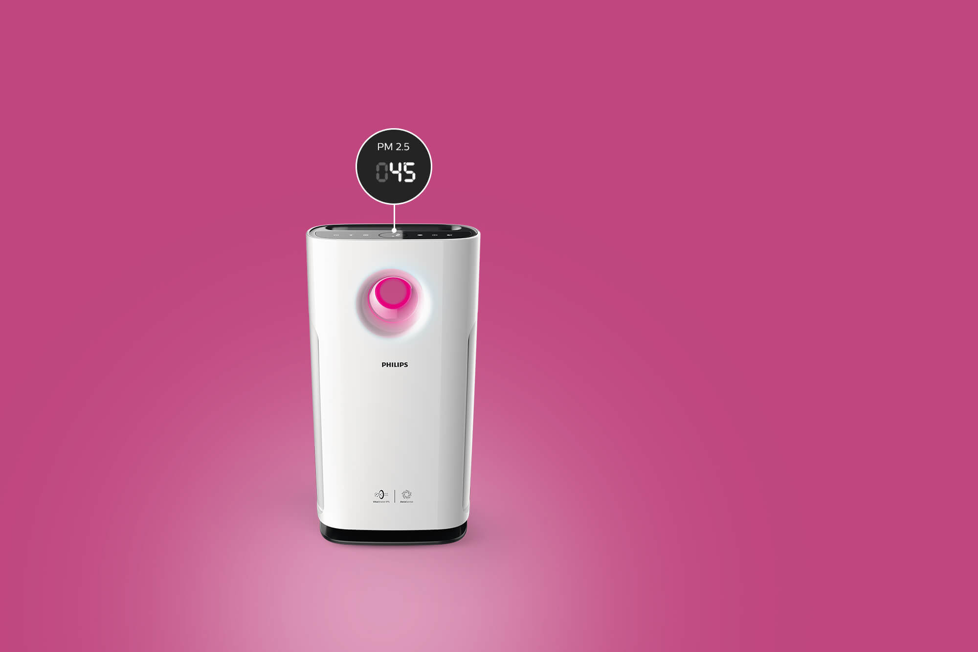 Oczyszczacz wskazuje aktualne stężenie cząsteczek PM2,5 w powietrzu g/m3.