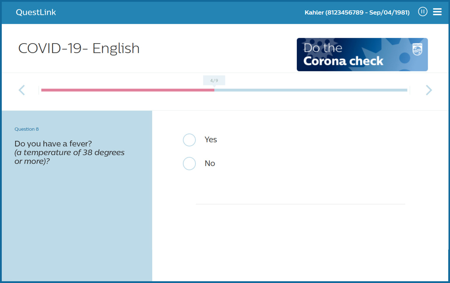 Philips może pomóc personelowi medycznemu i instytucjom opieki zdrowotnej w zarządzaniu zwiększonym przepływem pacjentów wynikającym z wybuchu epidemii COVID-19. W tym celu proponujemy dedykowane i skalowalne rozwiązanie telemedyczne, które ułatwia realizację badań przesiewowych online, a dzięki kwestionariuszom uzupełniającym i monitorowaniu wyników raportowanych przez pacjentów online, bieżące zarządzanie ryzykiem populacyjnym i pilnością udzielanych świadczeń w skoordynowany sposób.